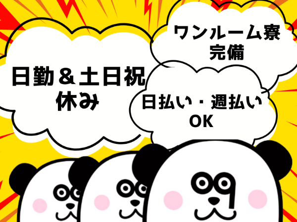 | 就業時間 | 【日勤】8:30~17:00 ※実働7.5時間(休憩60分) ※工場立ち上げ期につき、状況により勤務形態や時間が変わる可能性がございます。 【勤務期間】即日~長期 【契約更新】3ヶ月ごと ※入社より2週間は法定試用期間となります。試用期間中の給与は変わりません。 |
