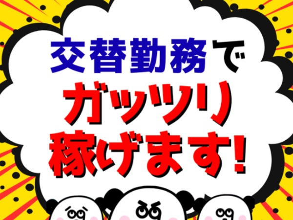 | 就業時間 | 【3交替】 [1]8:30~17:30 [2]16:30~翌1:30 [3]0:30~9:30 ※実働8時間(休憩60分) ※休憩は食事休憩のみですが、トイレ休憩は随時お取りいただけます。 【勤務期間】即日~長期 【契約更新】3ヶ月ごと ※入社より2週間は法定試用期間となります。試用期間中の時給は変わりません。 |